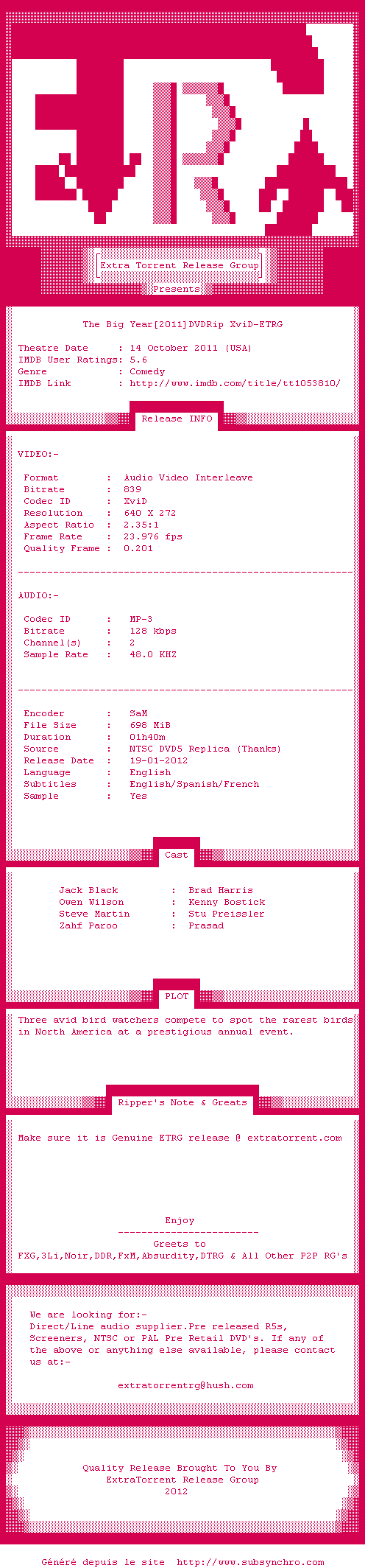 Voir le nfo de la release The.Big.Year.2011.DVDRip.XviD-ETRG