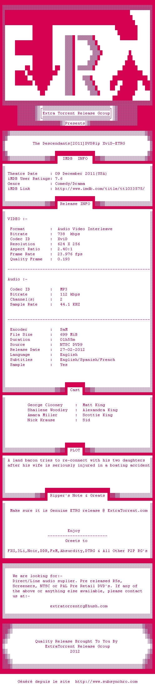 Georges Clooney grandiose, des seconds rôles épatants, des images d'Hawaï très loin des clichés, tout cela donne un très bon film. Même si le scénario peut sembler un peu faible, là n'est pas la question, c'est le rythme du film impulsée par la mise en scène qui prime.