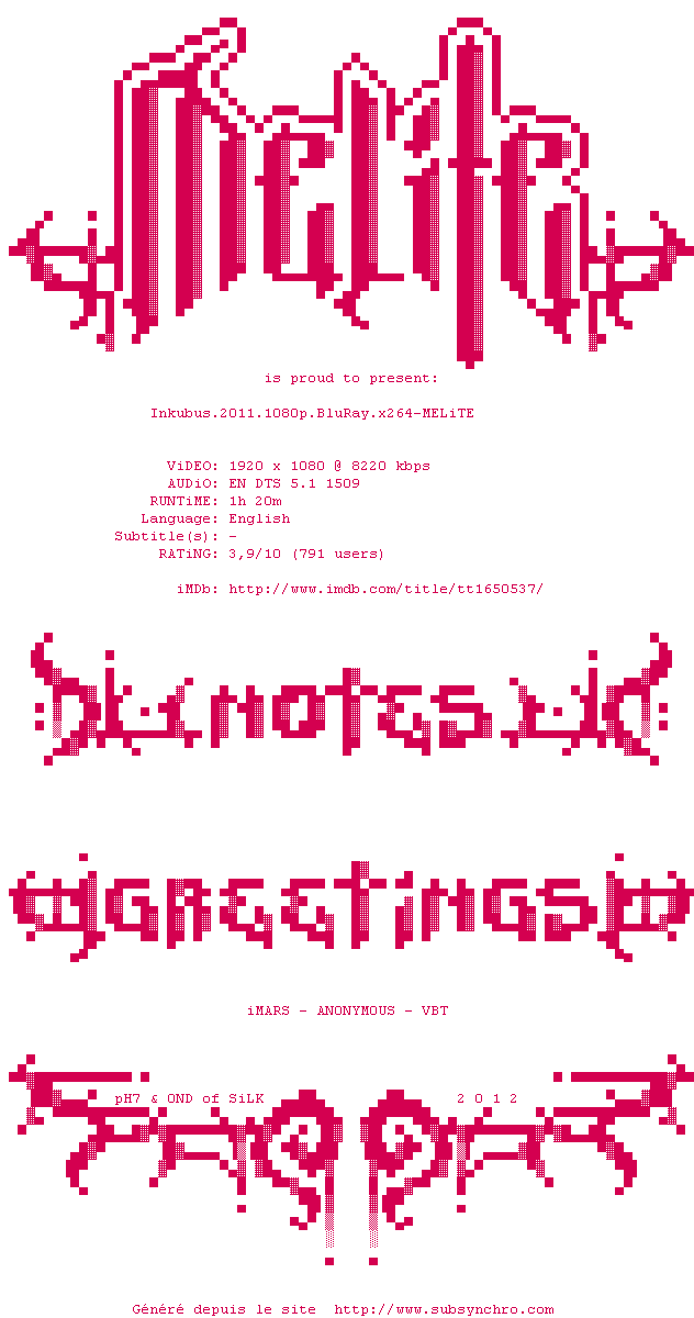 | Voir le nfo de la release Inkubus.2011.1080p.BluRay.x264-MELiTE | MELiTE | Inkubus.2011.1080p.BluRay.x264-MELiTE OpenSubtitles | 0 fichier | ||