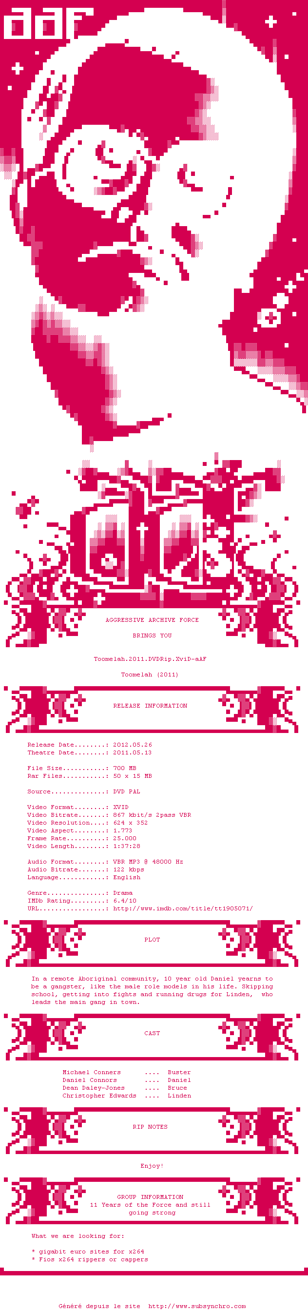 Voir le nfo de la release Toomelah.2011.DVDRip.XviD-aAF