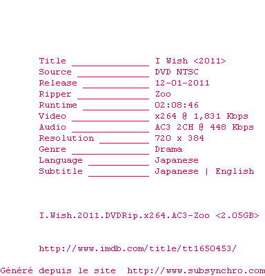 | ROVERS | I.Wish.2011.1080p.BluRay.x264-ROVERS OpenSubtitles | 0 fichier | |||