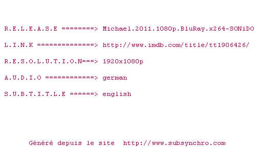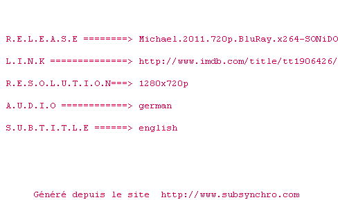| Voir le nfo de la release Michael.2011.1080p.BluRay.x264-SONiDO | SONiDO | Michael.2011.1080p.BluRay.x264-SONiDO OpenSubtitles | 0 fichier | ||