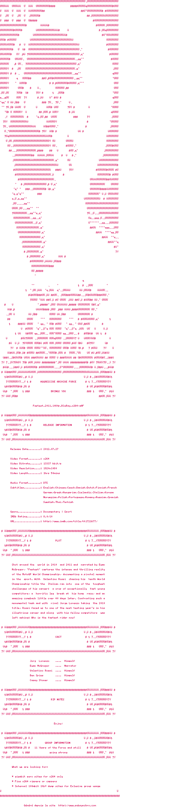 Tourné aux quatre coins du monde en 2010 et 2011 et narré par Ewan McGregor, ‘Fastest’ vous plonge dans la réalité intense et passionnelle du Championnat du Monde MotoGP, tout en revenant sur un moment clé de l’histoire du sport. Alors qu’il se lançait à la conquête d’un dixième titre mondial, Valentino Rossi s’était retrouvé face à l’un des plus grands challenges de sa carrière : une concurrence composée de jeunes pilotes aux talents exceptionnels, une terrible blessure chez lui au Mugello et un incroyable comeback moins de quarante jours après. Vaincu par son rival Jorge Lorenzo, Rossi a traversé l’une des saisons les plus difficiles de sa carrière en 2010 et devait comme ses compétiteurs se demander qui était désormais le plus rapide ?