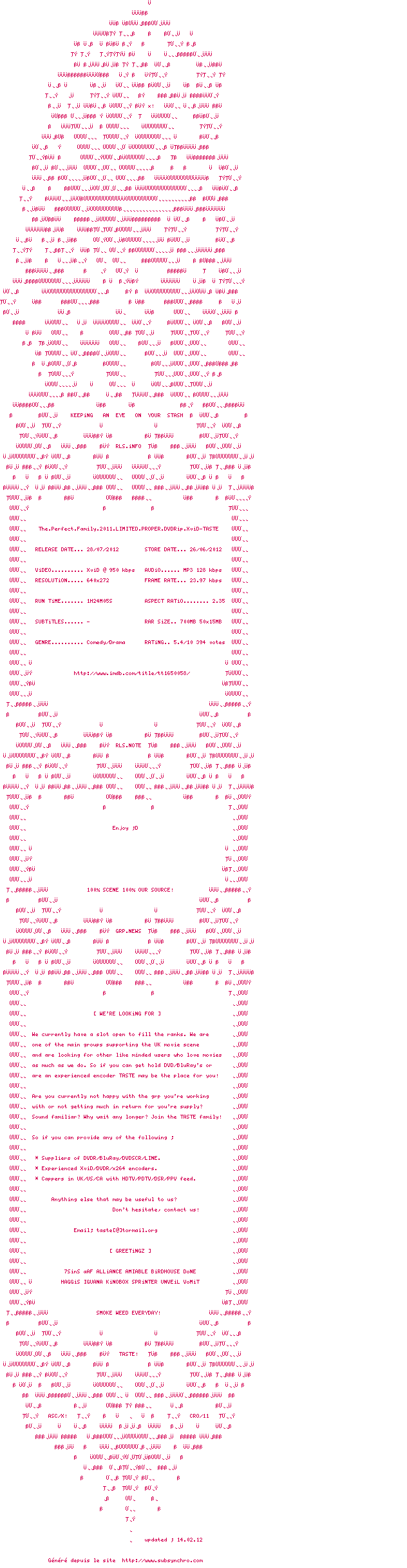 | Voir le nfo de la release The.Perfect.Family.2011.LIMITED.PROPER.DVDRip.XviD-TASTE | TASTE | The.Perfect.Family.2011.LIMITED.PROPER.DVDRip.XviD-TASTE OpenSubtitles | 0 fichier |