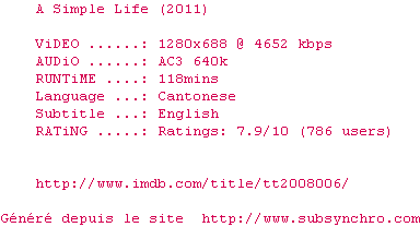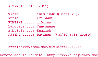 Voir le nfo de la release A.Simple.Life.2011.1080p.BluRay.x264-MELiTE