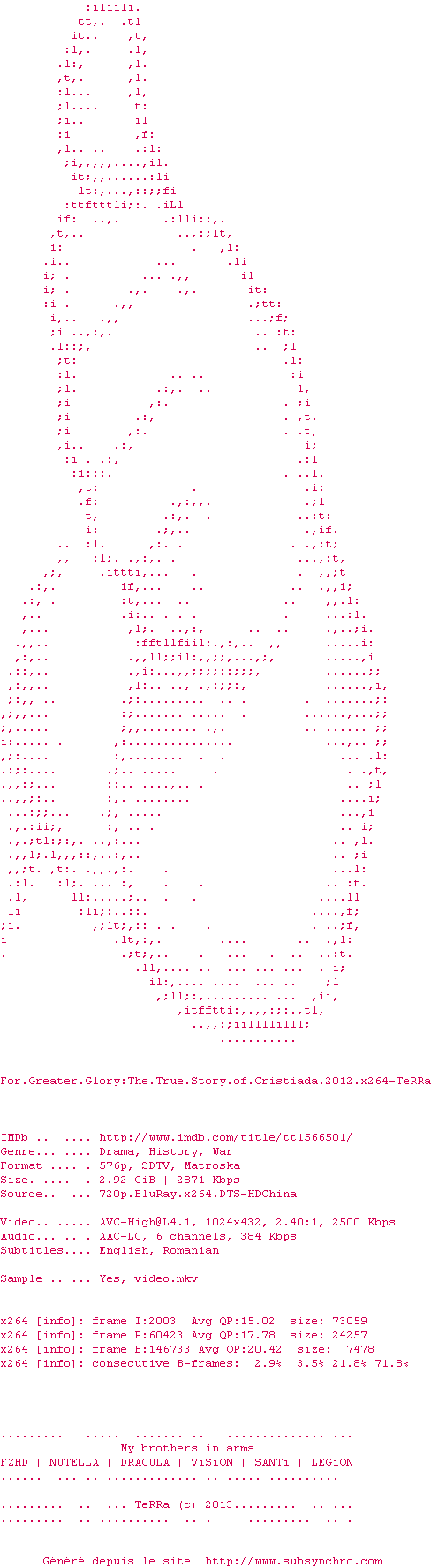 | Voir le nfo de la release For.Greater.Glory.2012.BRRip.AVC.x264-TeRRa | TeRRa | For.Greater.Glory.2012.BRRip.AVC.x264-TeRRa OpenSubtitles | 0 fichier |