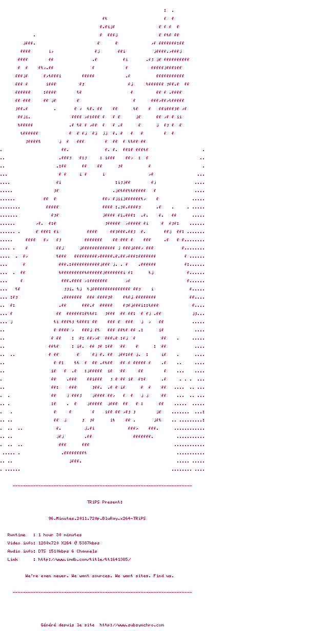 | Voir le nfo de la release 96.Minutes.2011.720p.BluRay.x264-TRiPS | TRiPS | 96.Minutes.2011.720p.BluRay.x264-TRiPS OpenSubtitles | 0 fichier |