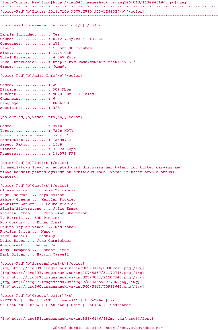 Voir le nfo de la release Butter.2011.720p.HDTV.XViD.AC3-LEGi0N