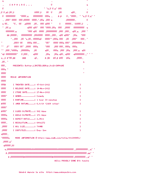 Voir le nfo de la release Butter.LIMITED.BDRip.XviD-SAPHiRE