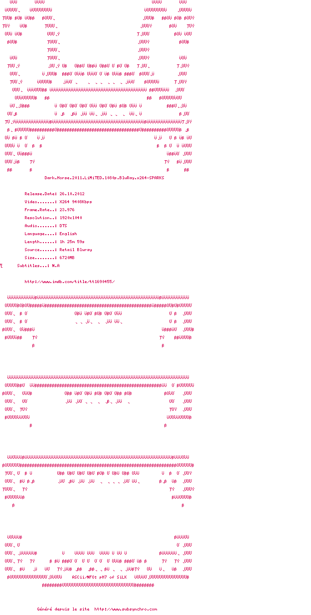 Voir le nfo de la release Dark.Horse.2011.LiMiTED.720p.BluRay.x264-SPARKS
