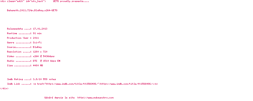 | Voir le nfo de la release Behemoth.2011.720p.BluRay.x264-VETO | VETO | Behemoth.2011.720p.BluRay.x264-VETO OpenSubtitles | 0 fichier | ||