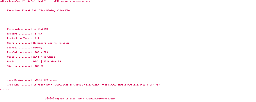 | Voir le nfo de la release Ferocious.Planet.2011.720p.BluRay.x264-VETO | VETO | Ferocious.Planet.2011.720p.BluRay.x264-VETO OpenSubtitles | 0 fichier | ||