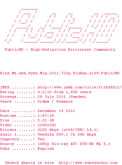 | Voir le nfo de la release Kiss.Me.aka.Kyss.Mig.2011.720p.BluRay.x264-PublicHD | PublicHD | Kiss.Me.aka.Kyss.Mig.2011.720p.BluRay.x264-PublicHD OpenSubtitles | 0 fichier | ||