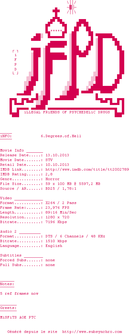 Voir le nfo de la release 6.Degrees.of.Hell.2012.720p.BluRay.x264.REPACK-iFPD