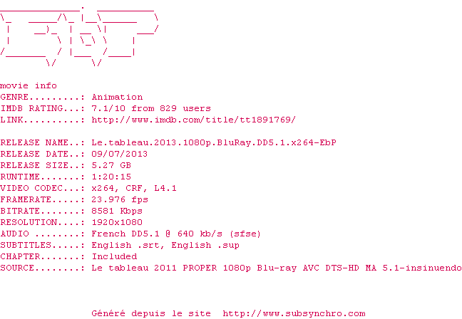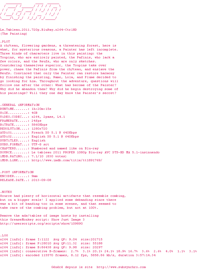 Le commentaire de Nuclear Commente par Nuclear (398), Le Lundi 14 Avril 2014 à 20h49 Parce qu'il est audacieux, subtil et pétillant, ce "Tableau" est une véritable merveille. 8 / 10 1 0