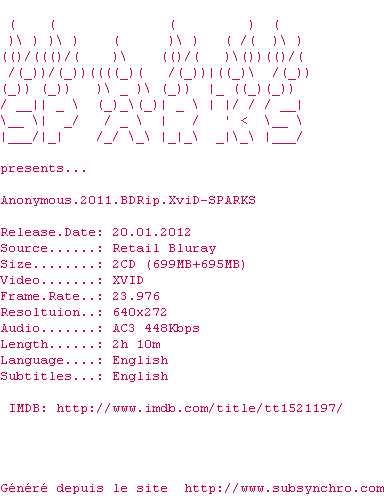 Telechargez le RSS « Fichier de la release Anonymous.2011.BDRip.XviD-SPARKS »