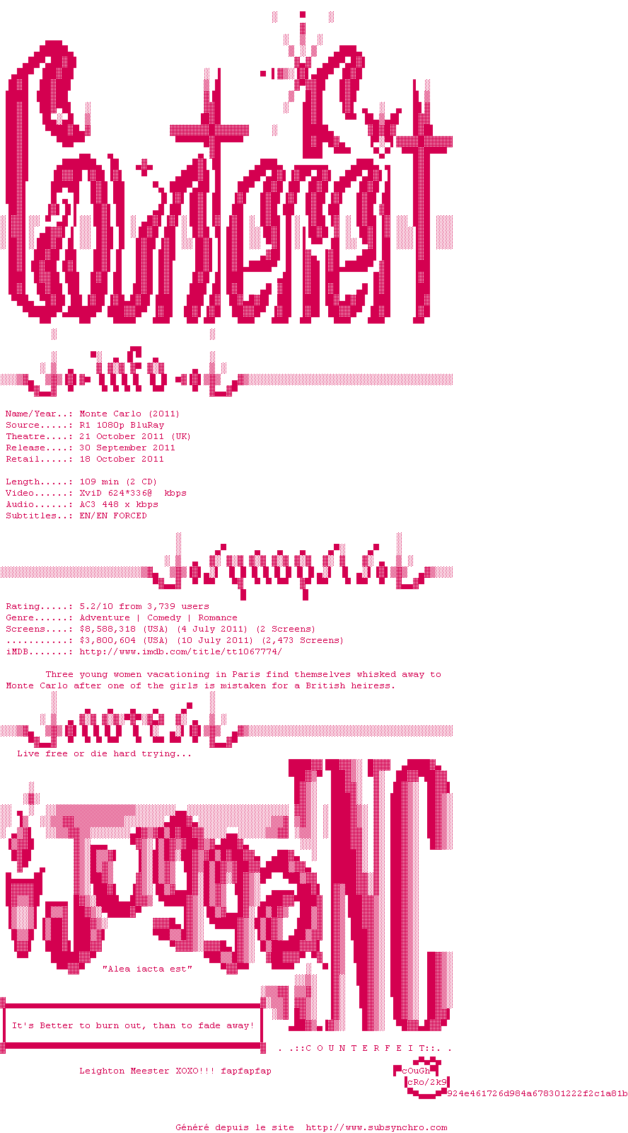 Telechargez le RSS « Fichier de la release Monte.Carlo.2011.BDRip.XviD-Counterfeit »