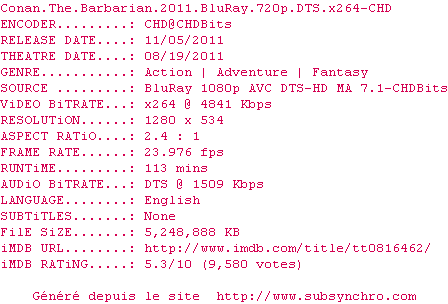 Telechargez le RSS « Fichier de la release Conan.The.Barbarian.2011.BluRay.720p.DTS.x264-CHD »