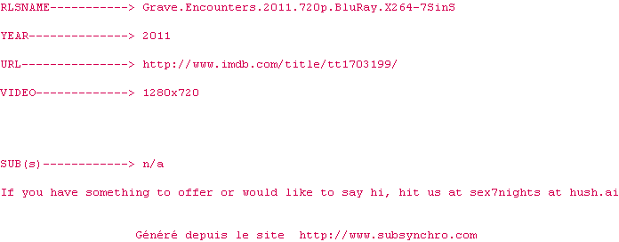 Y avez-vous pense ? Nous proposons déjà 1389 sous-titres pour le film Grave Encounters. Avez-vous essaye de voir si ces sous-titres etaient compatibles avec cette release ? On vous laisse le soin de tester cela pour nous et de contribuer au site en postant le sous-titre en cas de compatiblite constatee !