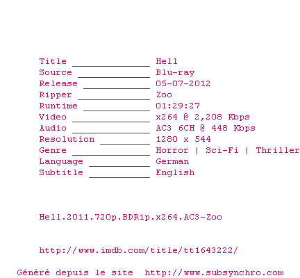 Telechargez le RSS « Fichier de la release Hell.2011.720p.BDRip.x264.AC3-Zoo »