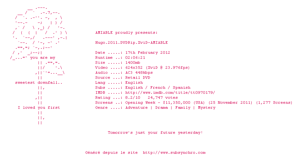 Telechargez le RSS « Fichier de la release Hugo.2011.DVDRip.XviD-AMIABLE »