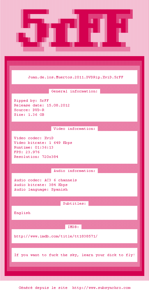 Telechargez le RSS « Fichier de la release Juan.de.los.Muertos.2011.DVDRip.XviD-5rFF »
