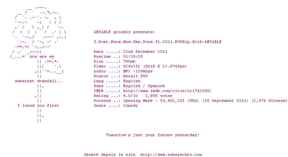 Telechargez le RSS « Fichier de la release I.Dont.Know.How.She.Does.It.2011.DVDRip.XviD-AMIABLE »