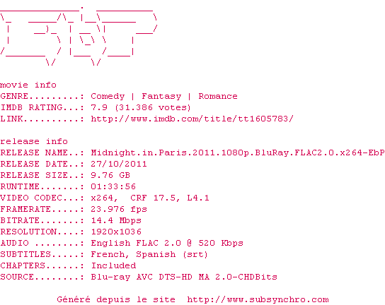 Midnight.in.Paris.2011.1080p.BluRay.FLAC2.0.x264-EbP.FR.srt Ajouté par Pinta Ajoute le 23-11-2012 17:06:38 Format : SRT Italique : Non Taille : 0.00Ko Telechargement : 133 Ajouter cette release à ma collection en cas de telechargement des sous-titres 0 0 0 Telecharger le ZiP contenant NFO, Affiche, Sous-titre (*.srt) Commentez le fichier Midnight.in.Paris.2011.1080p.BluRay.FLAC2.0.x264-EbP.FR.srt Commentez le fichier Midnight.in.Paris.2011.1080p.BluRay.FLAC2.0.x264-EbP.FR.srt Commentez ce fichier Le fichier 6435-1353686798.srt n'existe pas ! Telechargez le RSS « Fichier de la release Midnight.in.Paris.2011.1080p.BluRay.FLAC2.0.x264-EbP » Retour au film « Minuit à Paris »