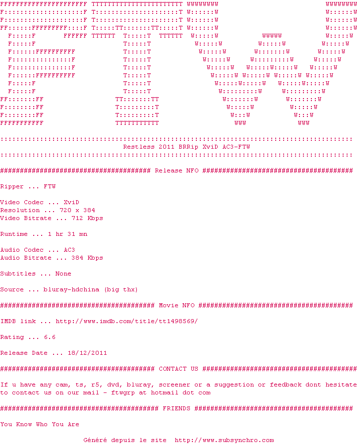 Telechargez le RSS « Fichier de la release Restless.2011.BRRip.XviD.AC3-FTW »
