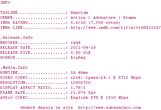 Telechargez le RSS « Fichier de la release Sanctum.2011.720p.BluRay.x264.DTS-WiKi »