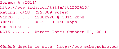 Telechargez le RSS « Fichier de la release Scream.4.720p.BluRay.x264-CROSSBOW »