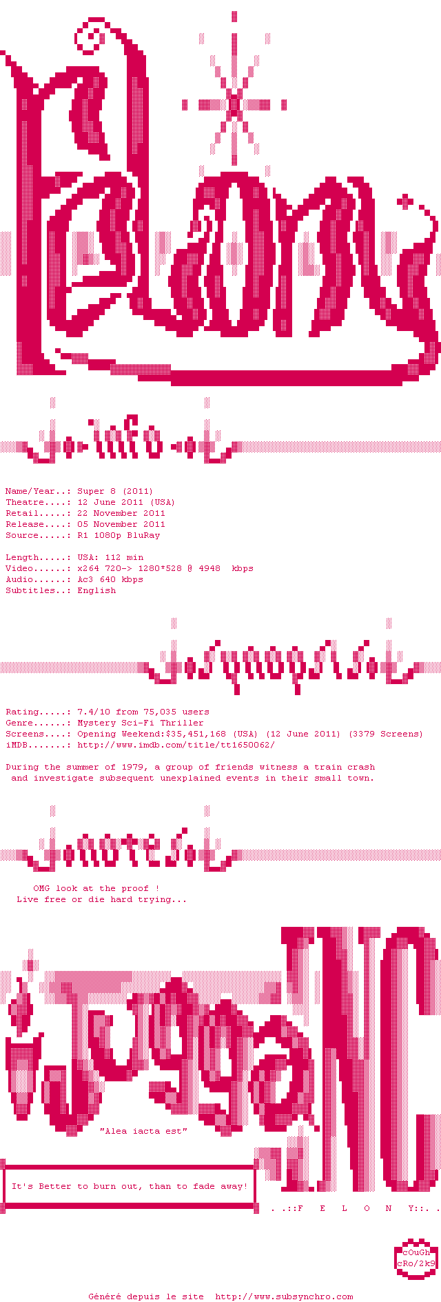 Telechargez le RSS « Fichier de la release Super.8.2011.720p.BluRay.x264-Felony »