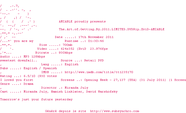 Telechargez le RSS « Fichier de la release The.Art.of.Getting.By.2011.LIMITED.DVDRip.XviD-AMIABLE »