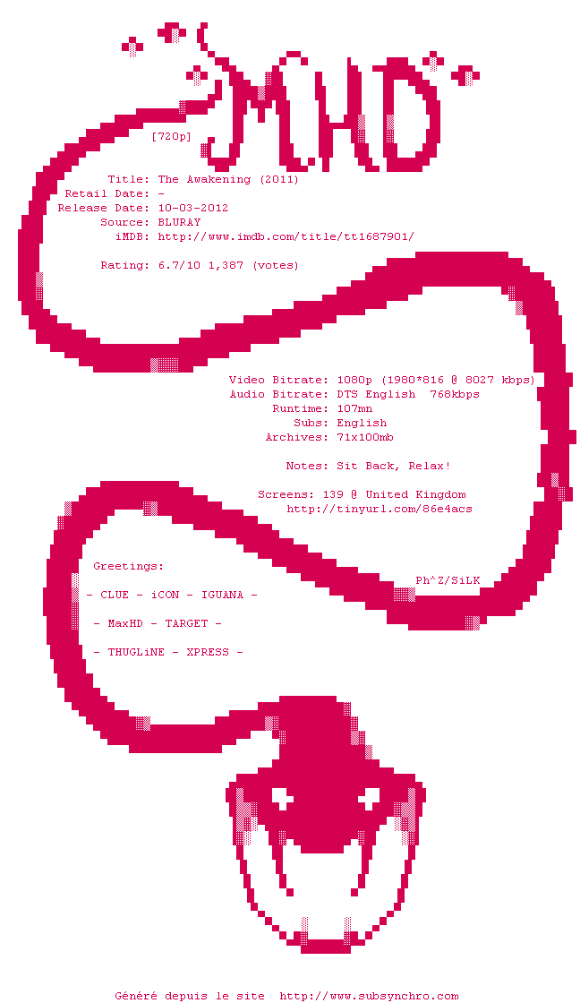Fichier identique àcelui que Latrell a posté pour The.Awakening.2011.LIMITED.720p.BluRay.X264-AMIABLE.