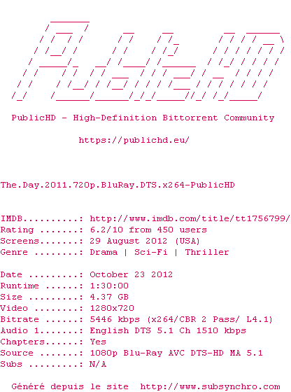 Telechargez le RSS « Fichier de la release The.Day.2011.720p.BluRay.DTS.x264-PublicHD »