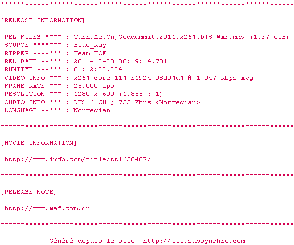 Telechargez le RSS « Fichier de la release Turn.Me.On.Goddammit.2011.x264.DTS-WAF »