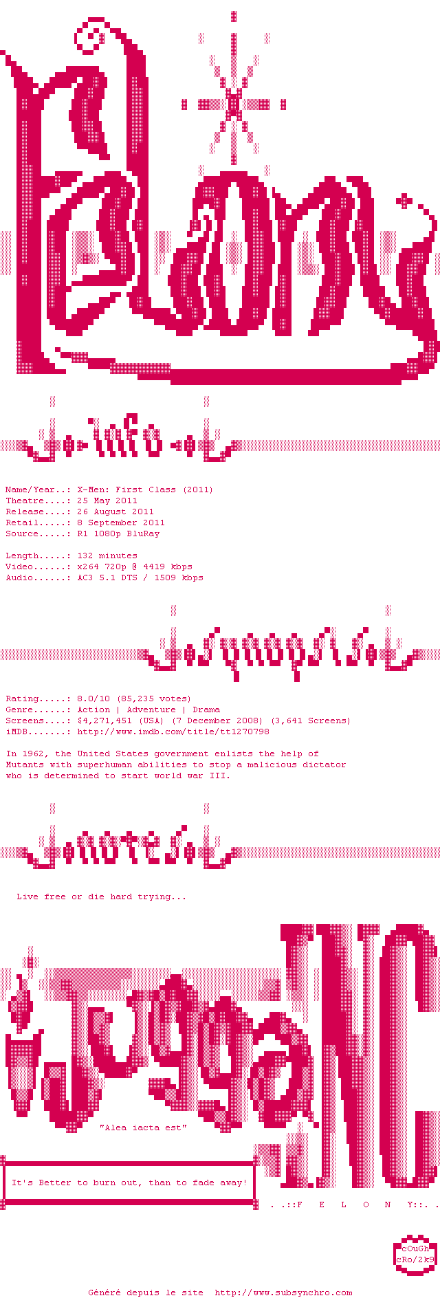 Telechargez le RSS « Fichier de la release X-Men.First.Class.2011.720p.BluRay.x264-Felony »