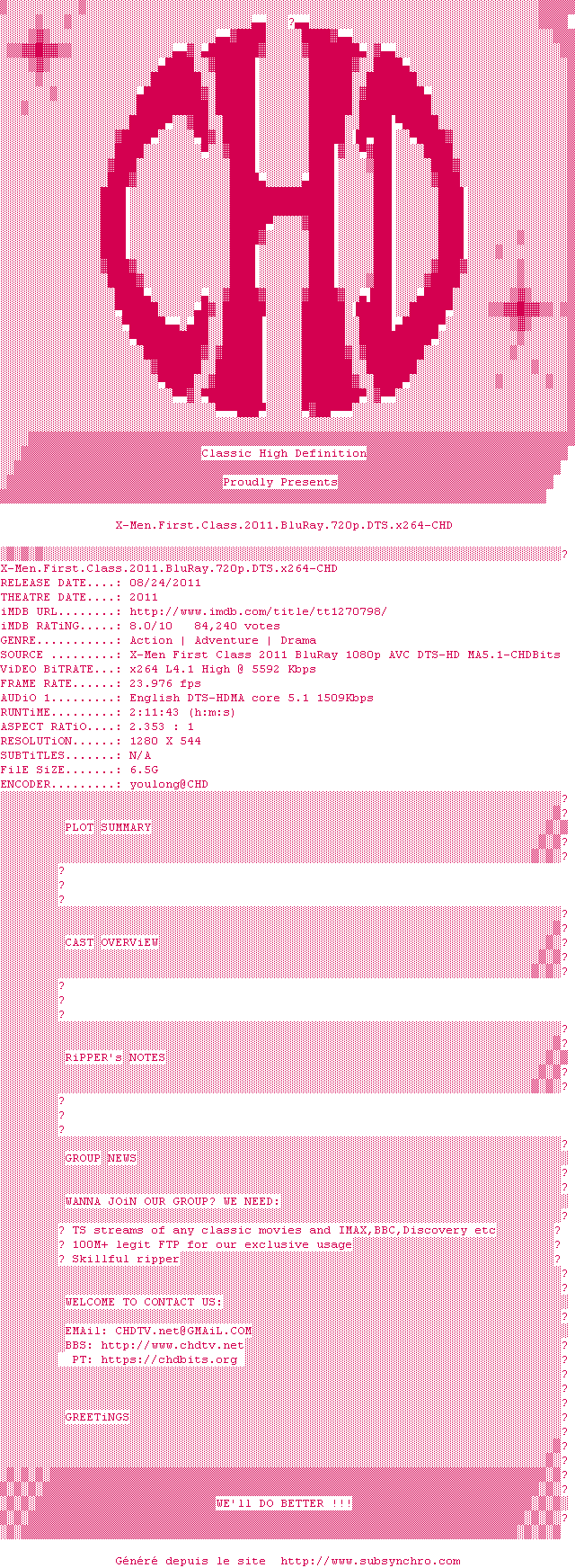 Telechargez le RSS « Fichier de la release X-Men.First.Class.2011.BluRay.720p.DTS.x264-CHD »