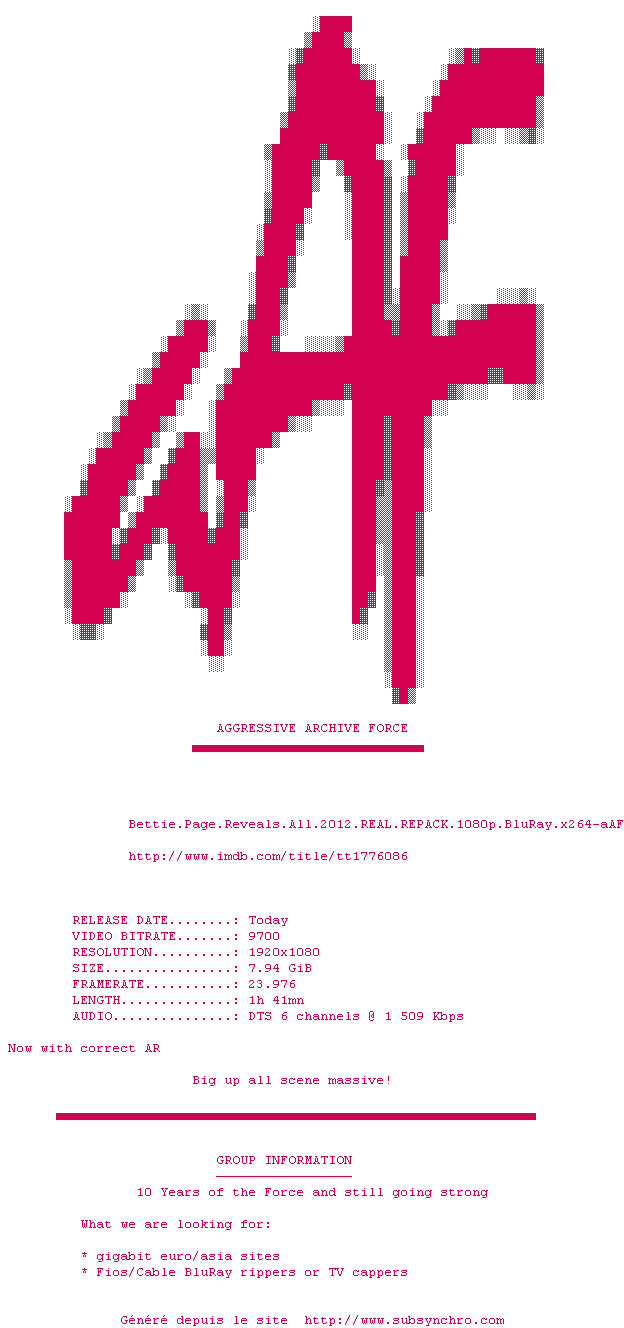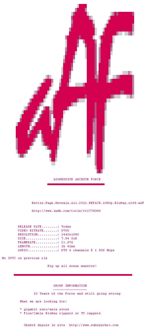 Voir le nfo de la release Bettie.Page.Reveals.All.2012.REPACK.1080p.BluRay.x264-aAF