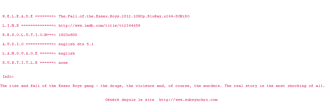Voir le nfo de la release The.Fall.of.the.Essex.Boys.2012.1080p.BluRay.x264-SONiDO