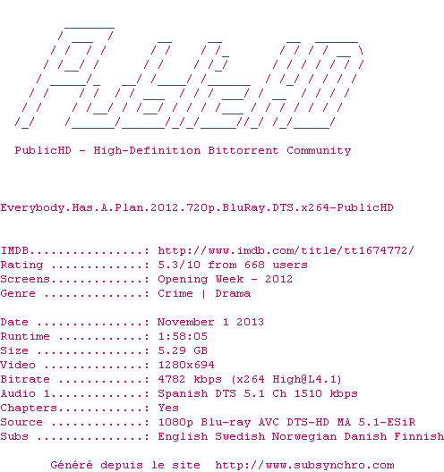 Voir le nfo de la release Everybody.Has.A.Plan.2012.720p.BluRay.DTS.x264-PublicHD
