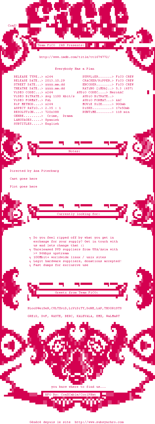 Voir le nfo de la release Everybody.Has.A.Plan.2012.DVDRip.x264-FiCO