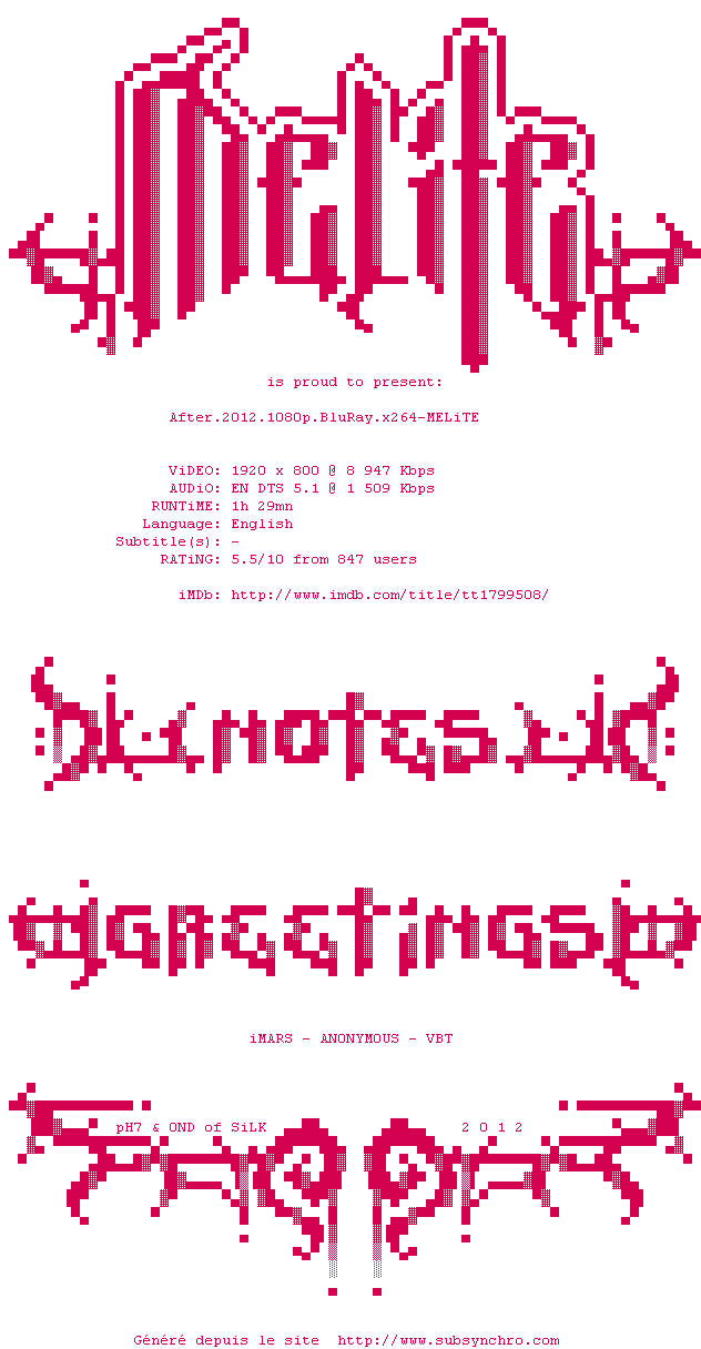 | Voir le nfo de la release After.2012.1080p.BluRay.x264-MELiTE | MELiTE | After.2012.1080p.BluRay.x264-MELiTE OpenSubtitles | 0 fichier | ||