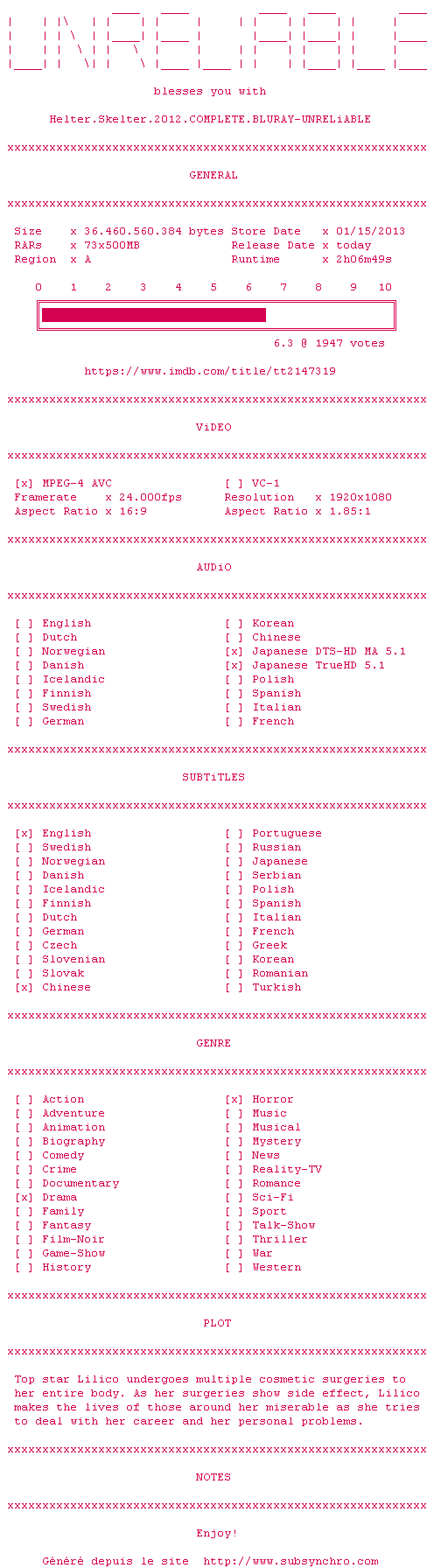 Voir le nfo de la release Helter.Skelter.2012.1080p.BluRay.x264-USURY