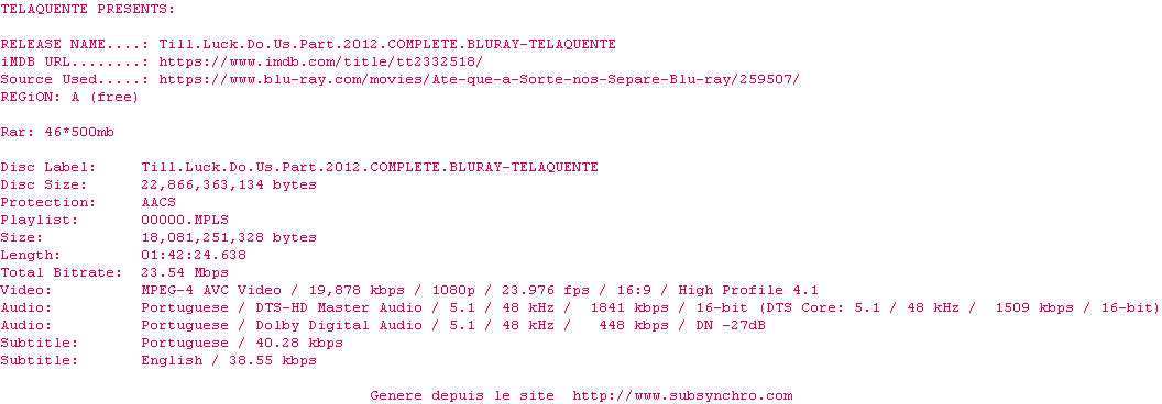 Voir le nfo de la release Till.Luck.Do.Us.Part.2012.COMPLETE.BLURAY-TELAQUENTE