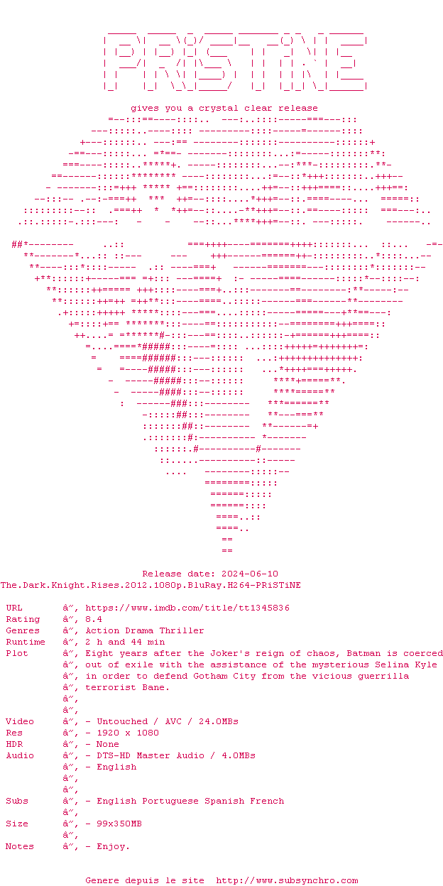 moins bon que le deuxième le film est plus penchée action quelques défauts sur la fin ( la facon dont bane se fait battre) mais n'oublions pas que christopher nolan avait prévue de faire un 3 ème film avec le joker mais le décès de heath ledger a contrecarreé ses plan donc chapeau très bon film certes moins bon que le 2ème mais très bon.