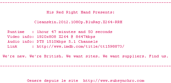 Le commentaire de Takuandaichi Commente par Takuandaichi (49), Le Mardi 29 Juillet 2014 à 18h15 Mieux : comme dans la vraie vie, il n'y a ni gentils ni méchants ! Clearskin (en Vo) est un polar sombre et lucide, fait avec peu de moyens et un Sean Bean en forme ! (même s'il a une tête de déterré) La guerre du renseignement est partout, dans chaque pays, et ne s'arrête jamais. Elle n'a que peu de rapports avec les médias. Avec la notion de bien et de mal. Elle est horrible pour tous et profondément traumatisante pour ceux qui la vivent. Clearskin en est un petit aperçu, bien joué et maîtrisé, assez semblable aux deux dernières oeuvres de Bigelow, mais en plus "confidentiel". A voir. 8 / 10 1 0