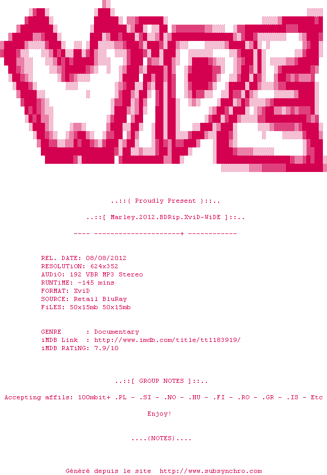 Voir le nfo de la release Marley.2012.BDRip.XviD-WiDE