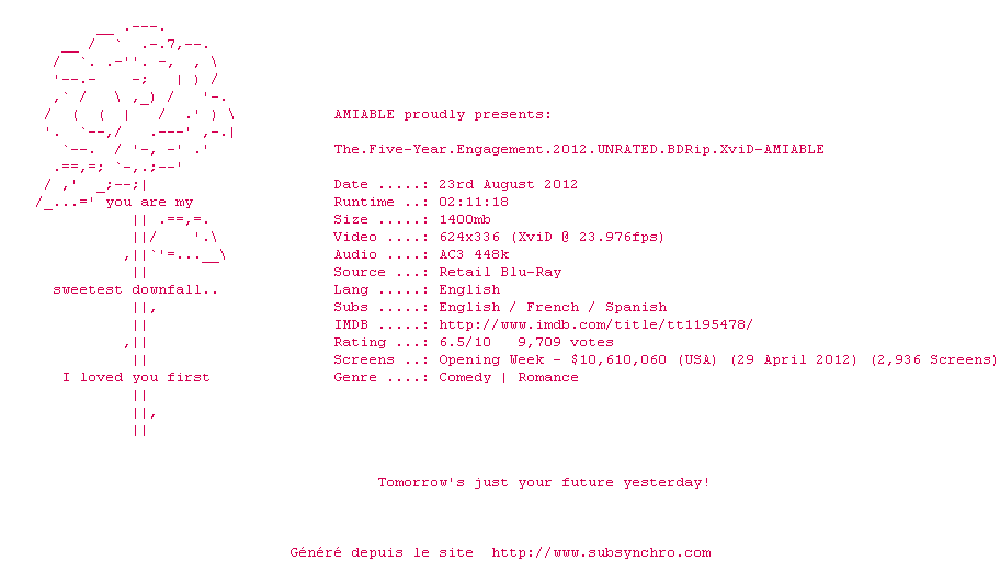 Voir le nfo de la release The.Five-Year.Engagement.2012.UNRATED.1080p.BluRay.x264-AMIABLE