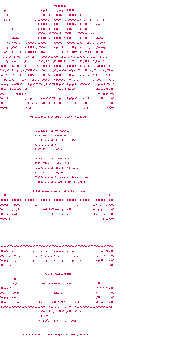 | Voir le nfo de la release Cloclo.2012.1080p.BluRay.x264-NOSCREENS | NOSCREENS | Cloclo.2012.1080p.BluRay.x264-NOSCREENS OpenSubtitles | 0 fichier | ||